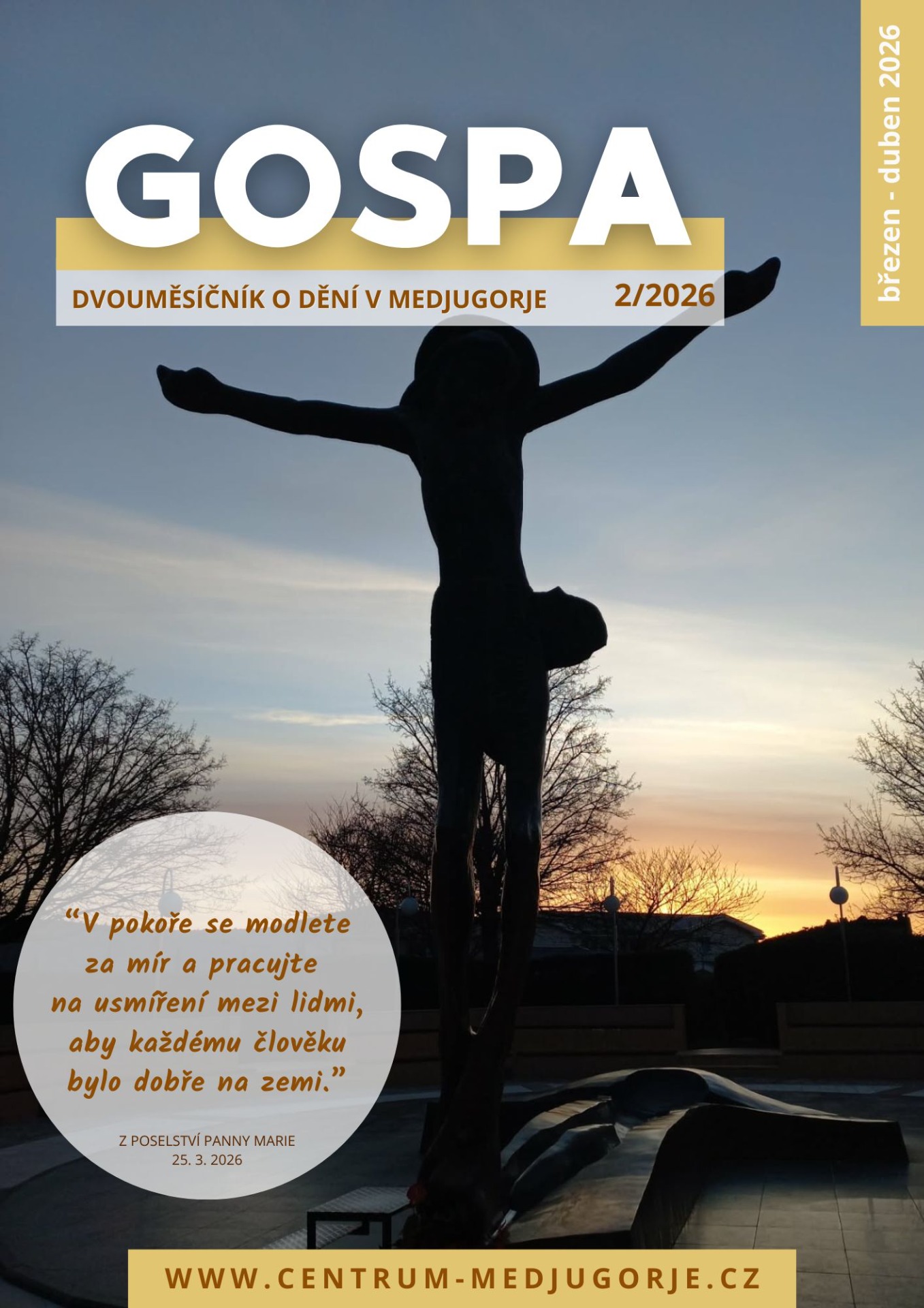 Jeden z bodů naší činnosti je vydávání online časopisu GOSPA. Jedná se o dvouměsíčník, který je vyplněn informacemi a novinkami z poutního místa, zamyšleními či rozjímáním nad různými texty, svědectvím a životními příběhy pro povzbuzení v duchovním životě. Součástí jsou i informace k organizovaným poutím a doporučení na hodnotné duchovní akce v ČR. A proč název "Gospa"? V chorvatštině se tak řekne "Panna Maria"...