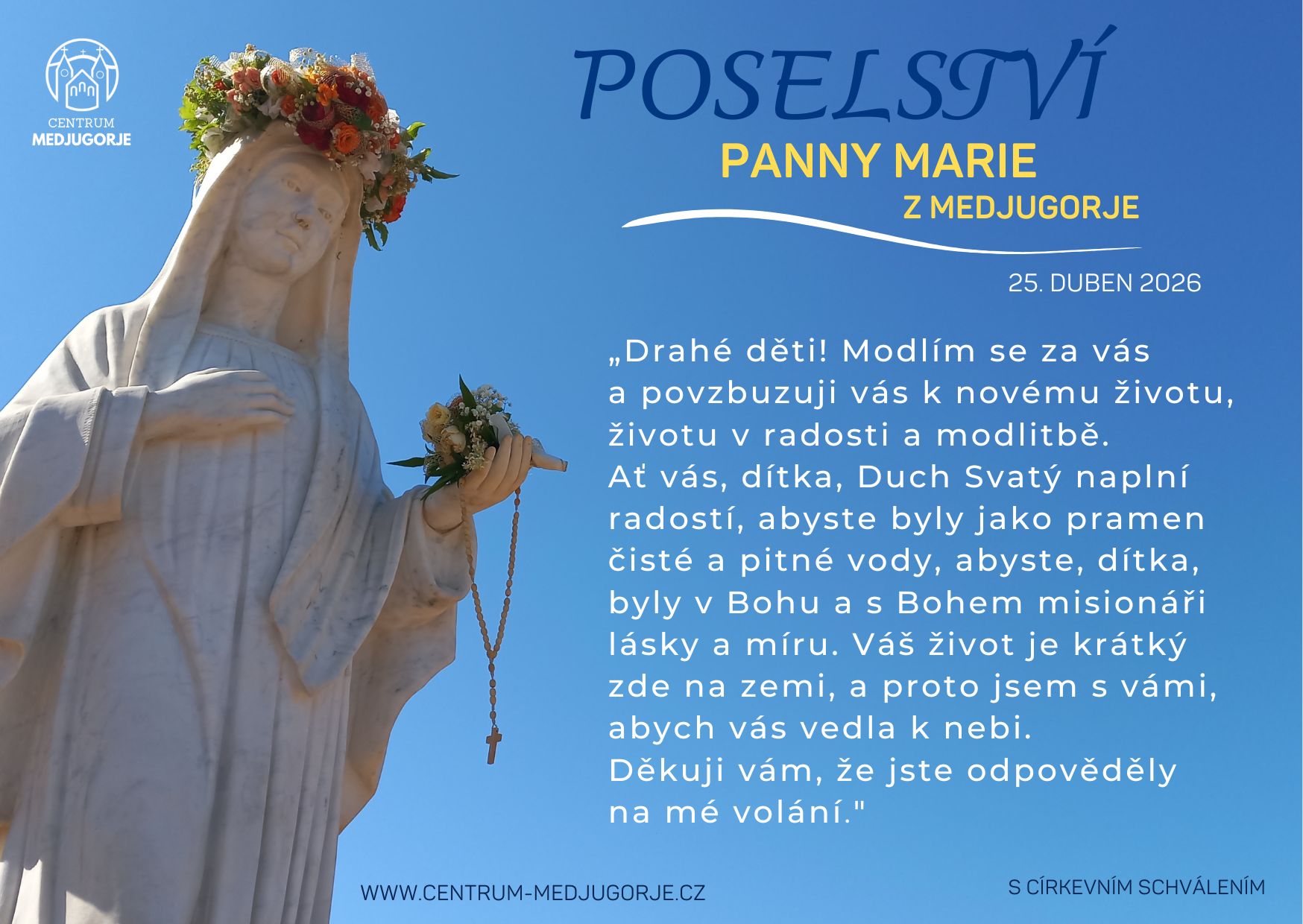 Drahé děti! Modlím se za vás a povzbuzuji vás k novému životu, životu v radosti a modlitbě. Ať vás, dítka, Duch Svatý naplní radostí, abyste byly jako pramen čisté a pitné vody, abyste, dítka, byly v Bohu a s Bohem misionáři lásky a míru. Váš život je krátký zde na zemi, a proto jsem s vámi, abych vás vedla k nebi. Děkuji vám, že jste odpověděly na mé volání.